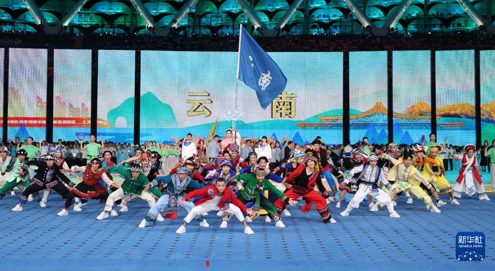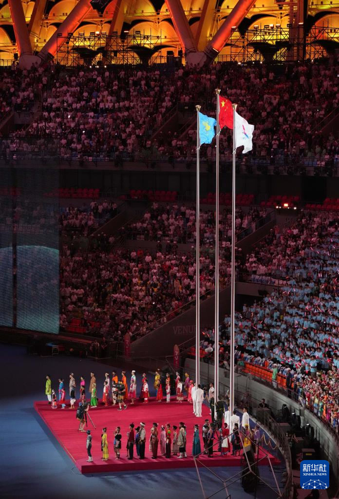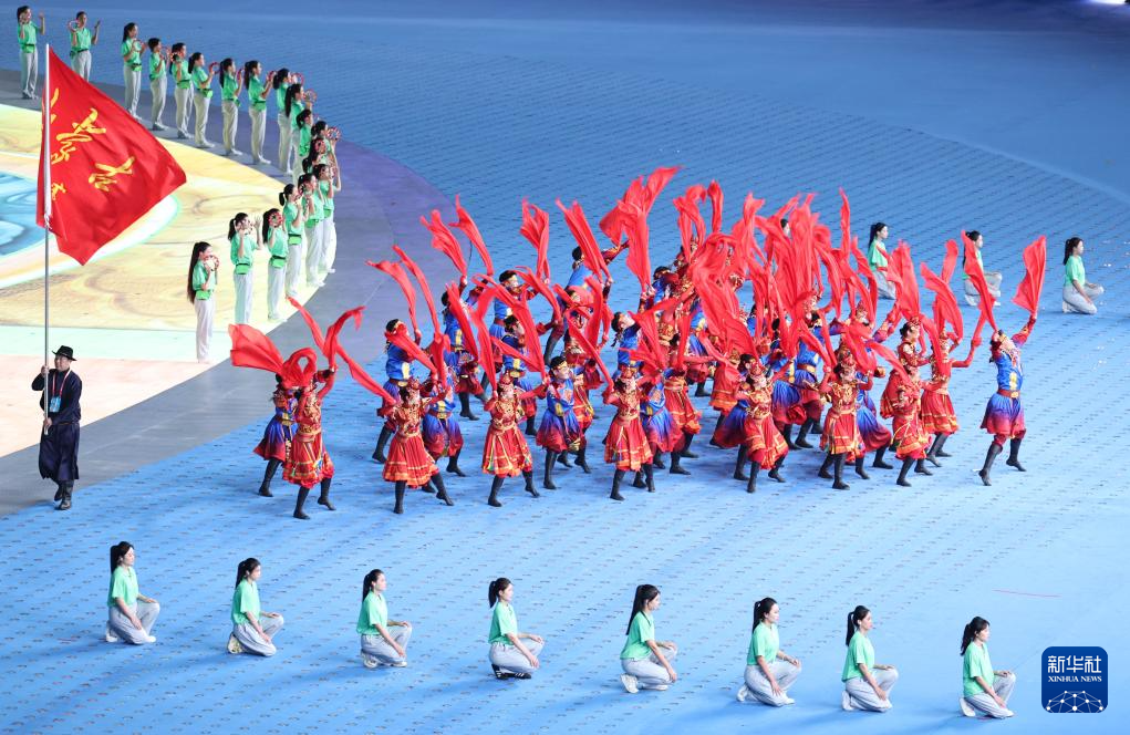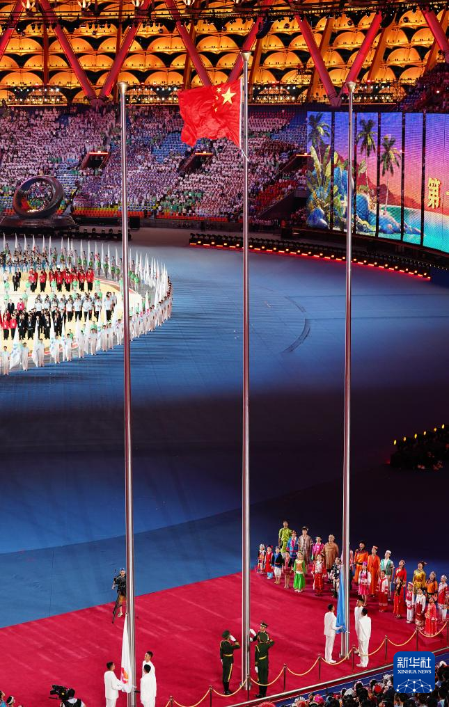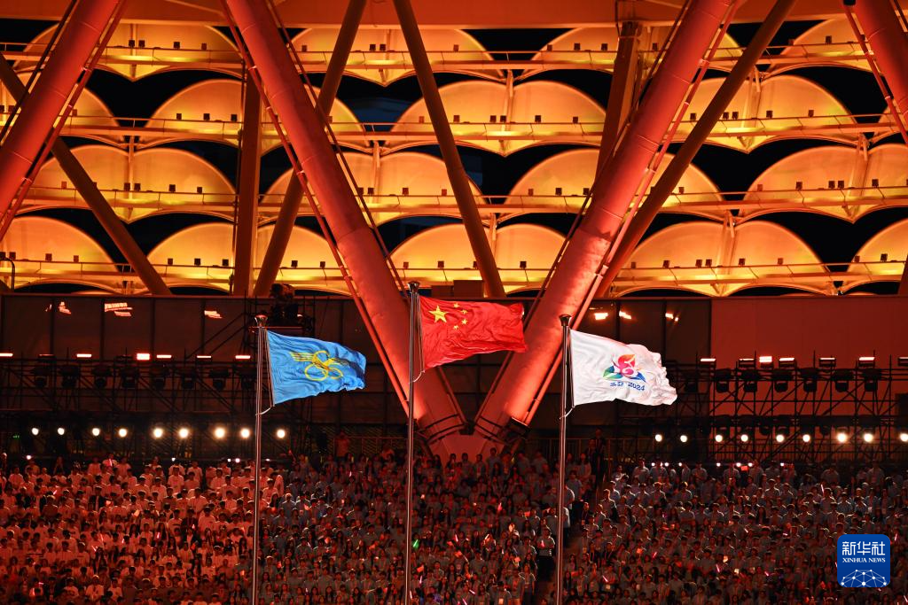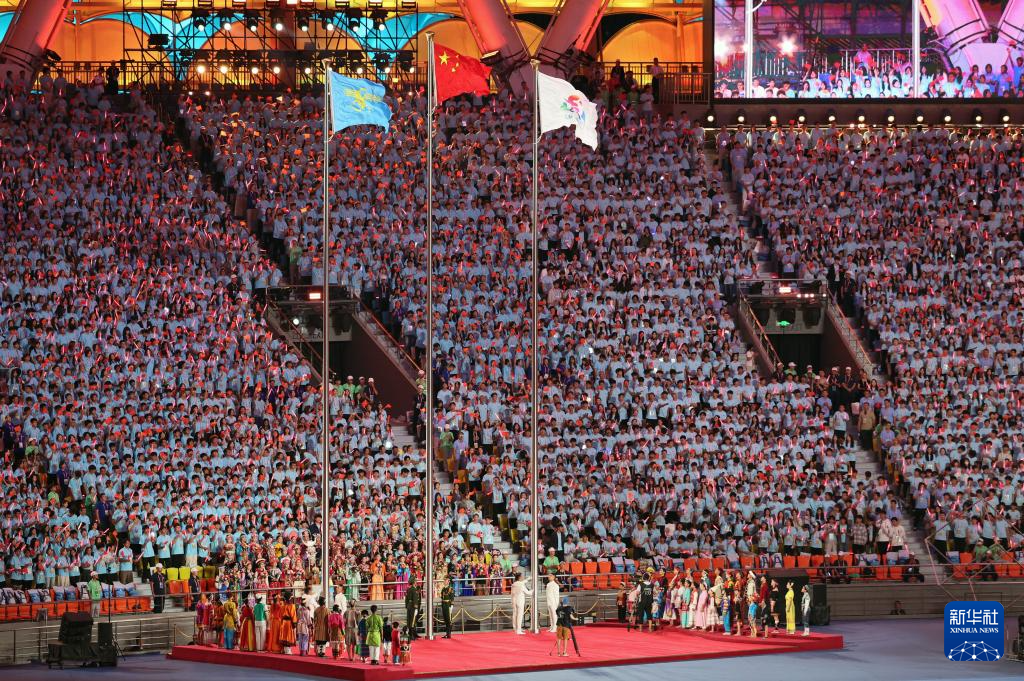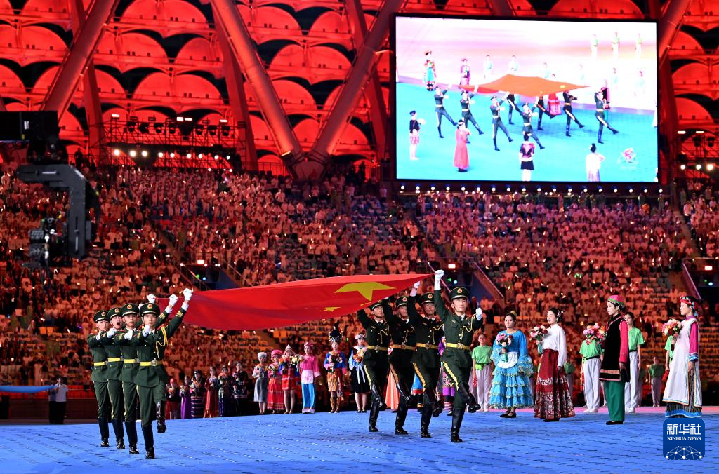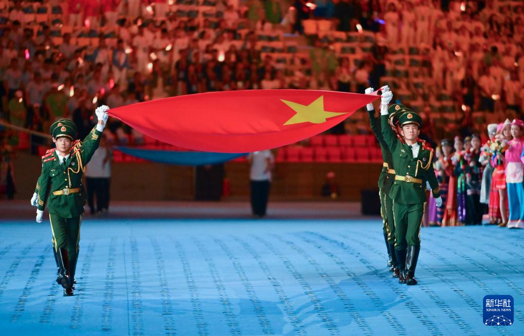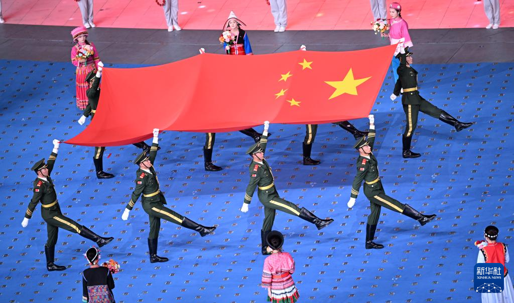 11月22日,開幕式現(xiàn)場升起中華人民共和國國旗、中華人民共和國少數民族傳統(tǒng)體育運動會會旗和中華人民共和國第十二屆少數民族傳統(tǒng)體育運動會會旗。