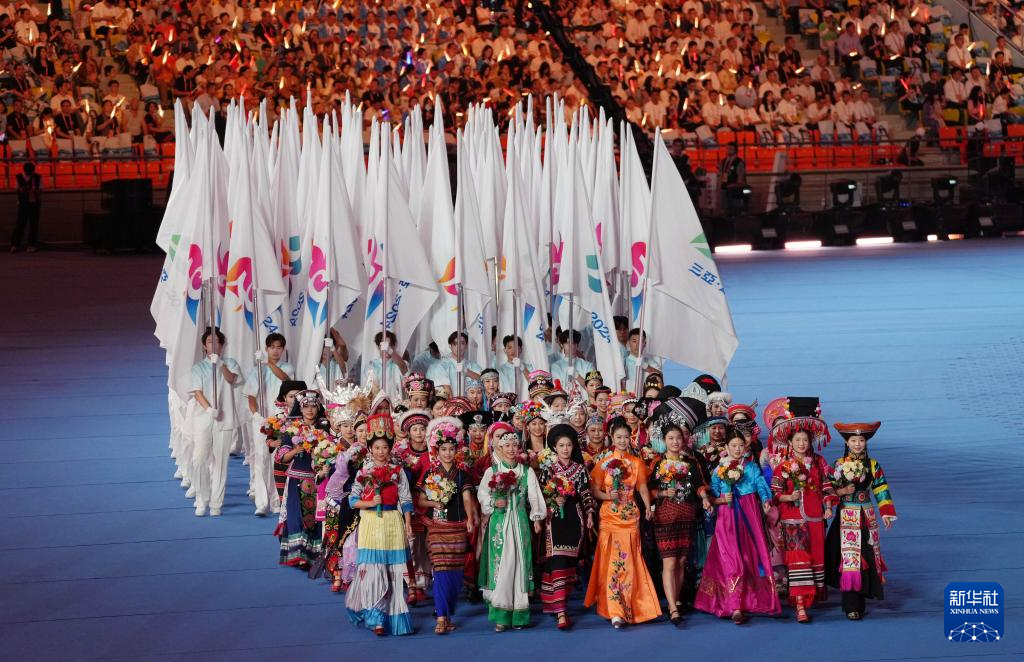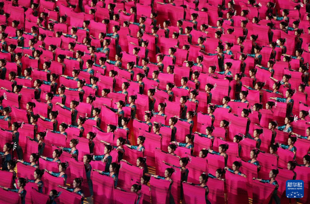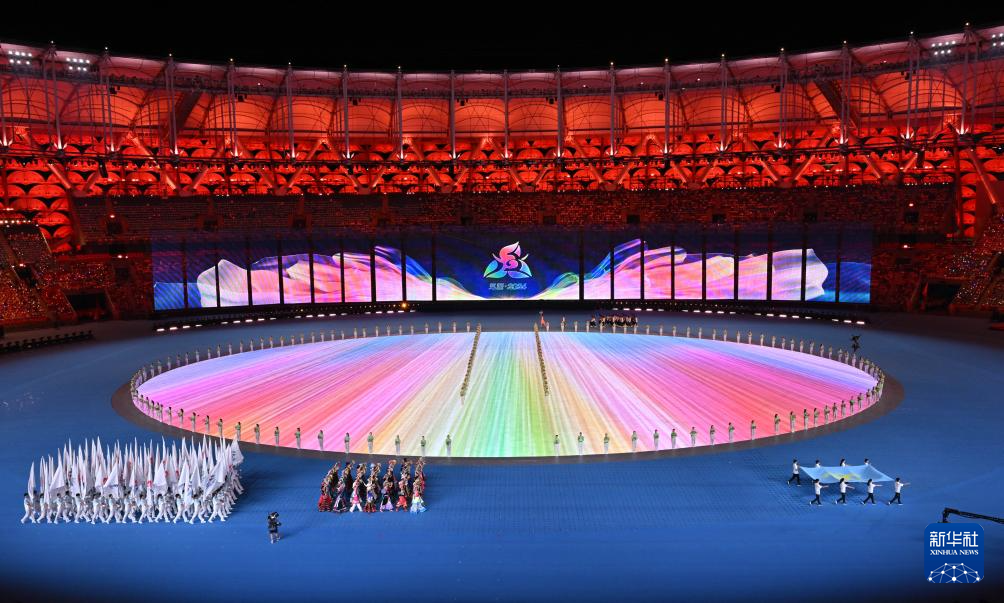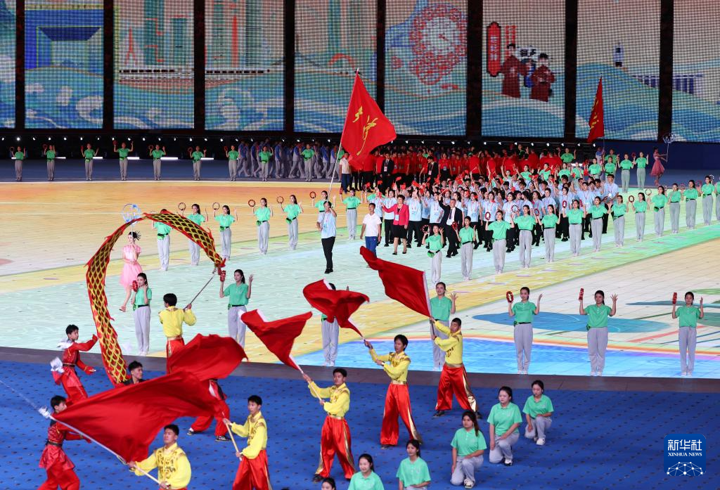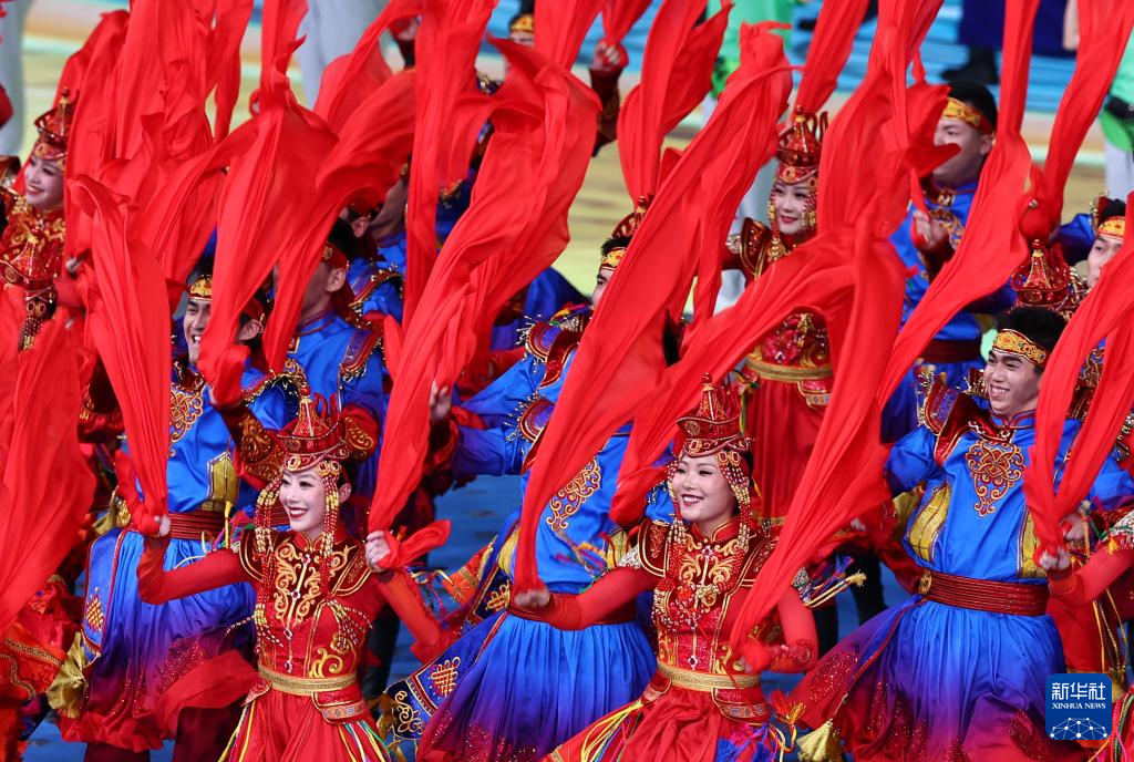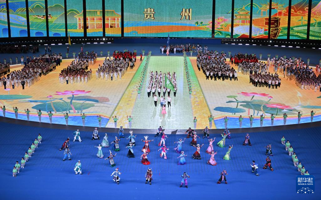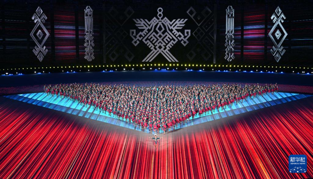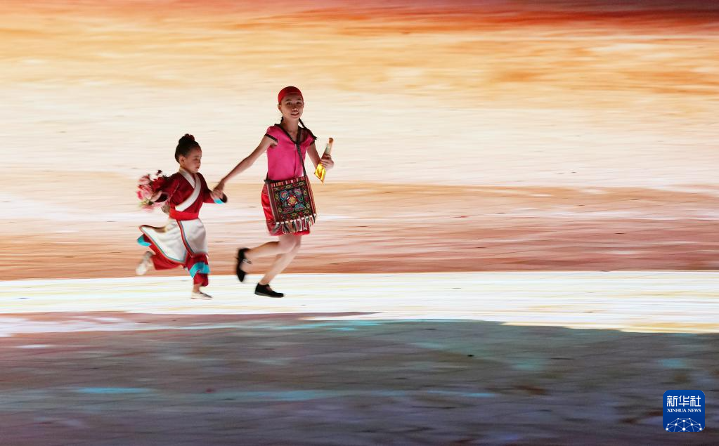11月22日,開幕式現(xiàn)場升起中華人民共和國國旗、中華人民共和國少數民族傳統(tǒng)體育運動會會旗和中華人民共和國第十二屆少數民族傳統(tǒng)體育運動會會旗。
