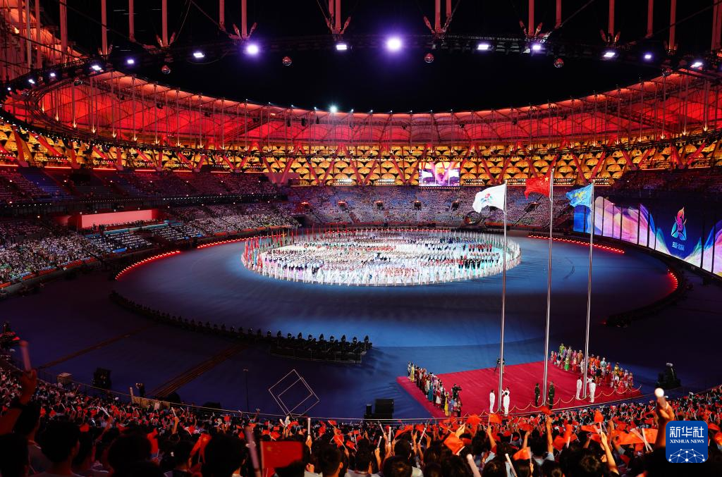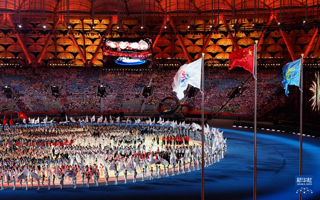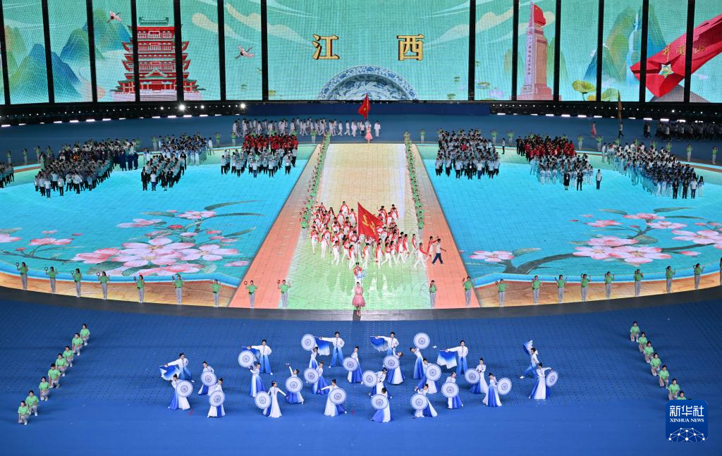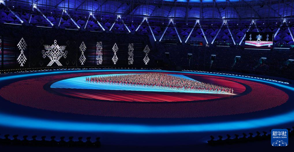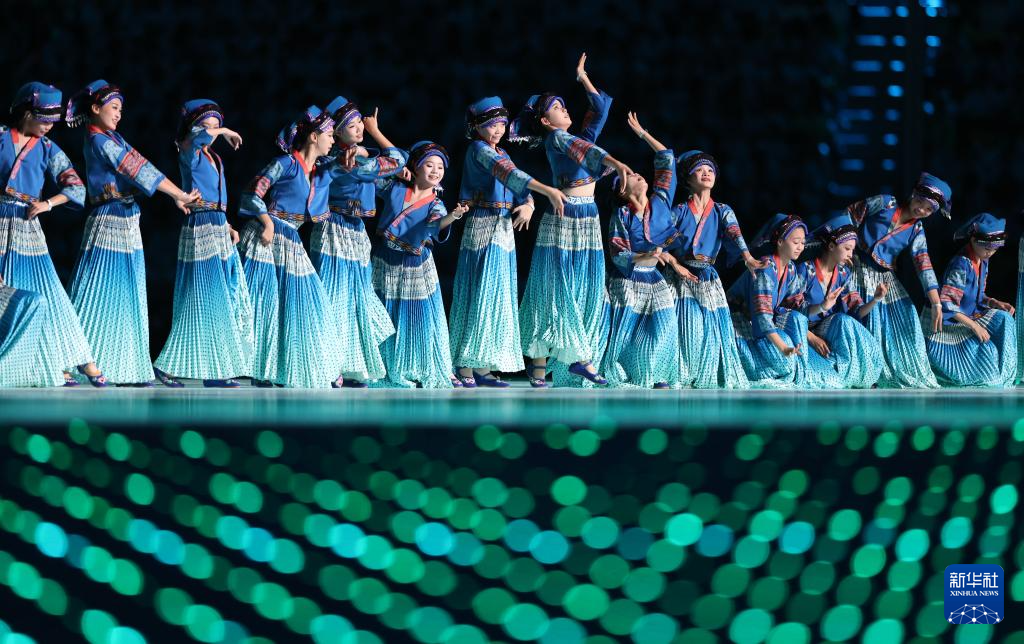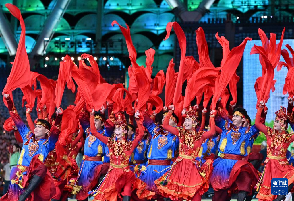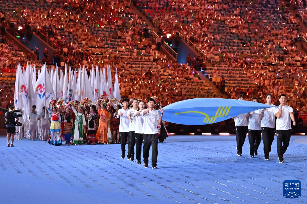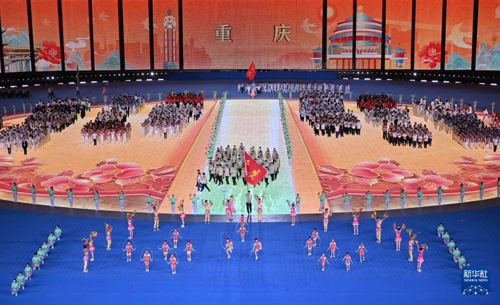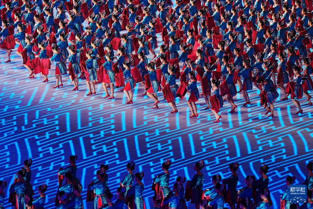 11月22日,開幕式現(xiàn)場升起中華人民共和國國旗、中華人民共和國少數民族傳統(tǒng)體育運動會會旗和中華人民共和國第十二屆少數民族傳統(tǒng)體育運動會會旗。