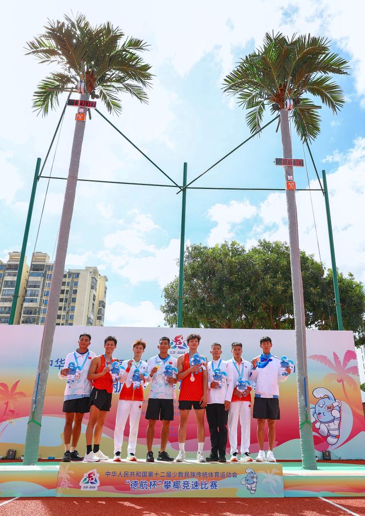 11月24日,獲獎選手在頒獎儀式上合影。當日,第十二屆全國少數(shù)民族傳統(tǒng)體育運動會攀椰競速男子9米決賽在西南大學三亞中學體育場舉行。新華社記者 楊植森 攝