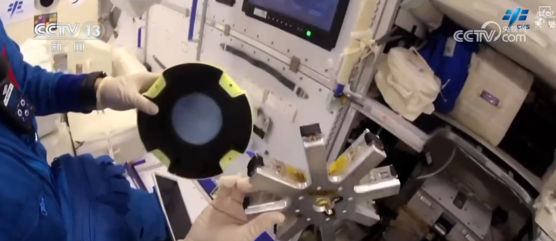 乘組還完成了流體物理實驗柜固液介觀實驗單元樣品盤檢查、實驗樣品更換,無容器柜實驗腔體樣品清理、實驗樣品更換、軸心機構電極維護等多項操作。