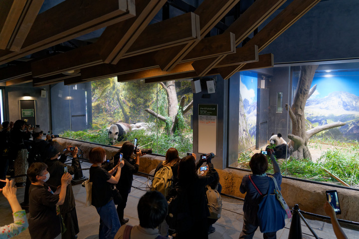 2024年9月28日,參觀者在日本東京上野動物園拍攝留念,告別大熊貓“比力”(左)和“仙女”(右)。新華社記者張笑宇 攝