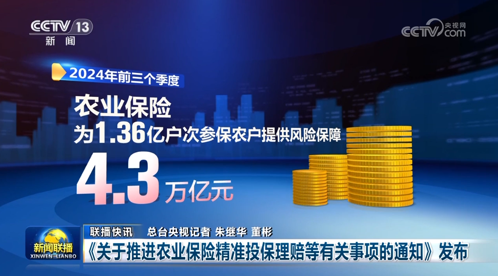 金融監(jiān)管總局等四部門近日聯(lián)合發(fā)布通知,對農(nóng)業(yè)保險投保理賠、應(yīng)收保費、條款費率、數(shù)據(jù)共享等提出要求,進一步提高投保理賠精準(zhǔn)性,推動我國農(nóng)業(yè)保險高質(zhì)量發(fā)展。今年前三個季度,農(nóng)業(yè)保險為1.36億戶次參保農(nóng)戶提供風(fēng)險保障4.3萬億元。