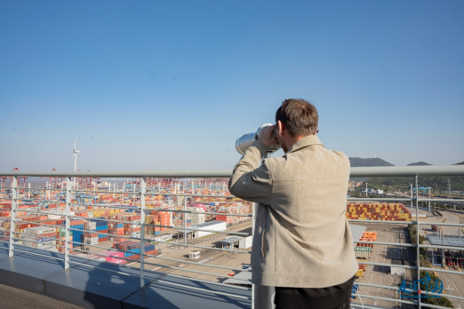 記者們站在觀景平臺(tái),通過望遠(yuǎn)鏡親眼見證了全球最繁忙集裝箱港口之一的現(xiàn)代化作業(yè),他們爭(zhēng)相與壯觀的碼頭場(chǎng)景合影留念。來自哈薩克斯坦《誠(chéng)實(shí)報(bào)》社會(huì)文化部主任納烏雷茲別克·薩爾沙耶夫在接受環(huán)球網(wǎng)記者采訪時(shí)說道“寧波舟山港的運(yùn)作效率和智能化管理令人贊嘆,它無疑是全球物流行業(yè)的標(biāo)桿?!?/p>