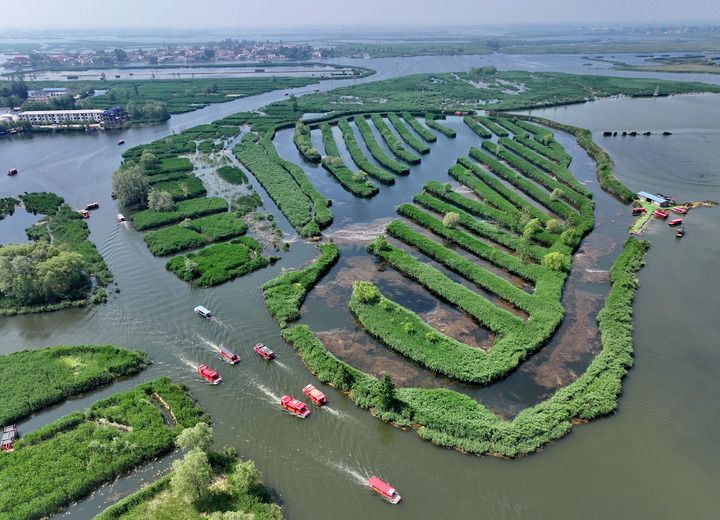 游船在河北雄安新區(qū)白洋淀內(nèi)游覽(2024年5月8日攝,無人機(jī)照片)。