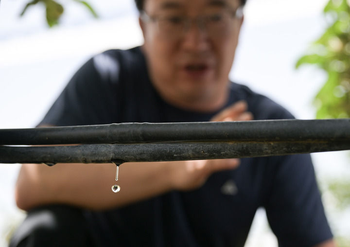 在陜西省延安市洛川縣槐柏鎮(zhèn)度古村“飛天”蘋果基地灌溉示范點(diǎn),節(jié)水滴灌系統(tǒng)為果樹灌溉(2024年6月23日攝)。