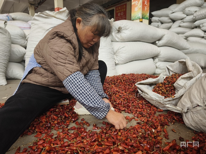 工人梁龍先正在分揀辣椒(央廣網(wǎng)記者 欒小琳 攝)