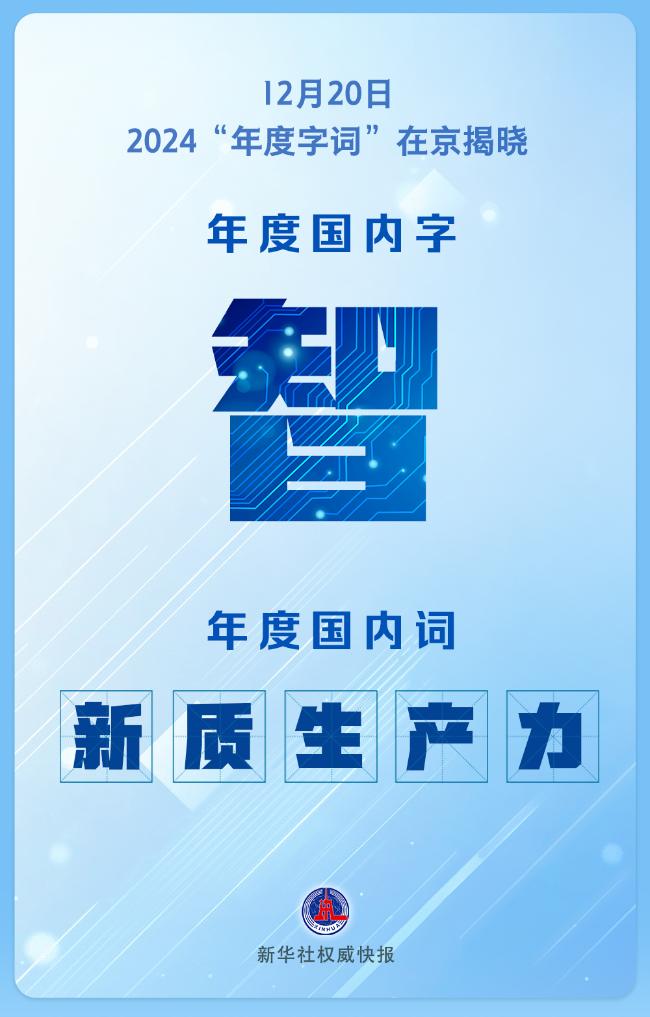 12月20日,“漢語盤點2024”活動在京揭曉“年度字詞”——“智”“新質(zhì)生產(chǎn)力”“變”“人工智能”分別當(dāng)選2024年度國內(nèi)字、國內(nèi)詞、國際字、國際詞。