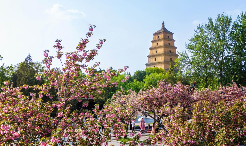 游客在西安大雁塔下游覽(無人機(jī)照片,2024年4月10日攝)。 新華社記者 鄒競一 攝
