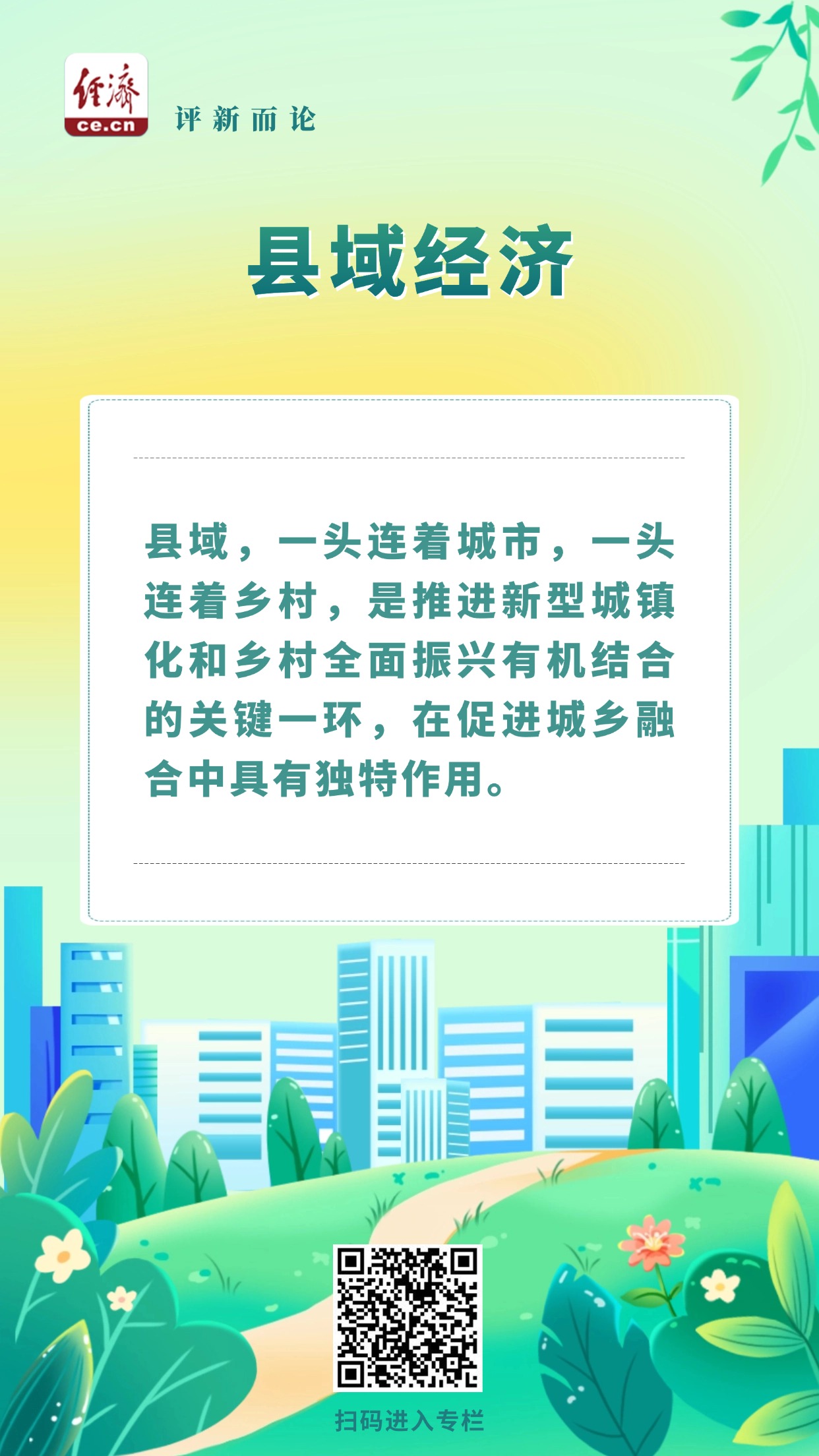 縣域,一頭連著城市,一頭連著鄉(xiāng)村,是推進新型城鎮(zhèn)化和鄉(xiāng)村全面振興有機結(jié)合的關鍵一環(huán),在促進城鄉(xiāng)融合中具有獨特作用。因此,發(fā)展壯大縣域經(jīng)濟,還要把縣域發(fā)展納入城鄉(xiāng)融合、區(qū)域協(xié)調(diào)發(fā)展的大格局中。在完善自身基礎設施建設、提高公共服務水平的過程中,縣域要充分發(fā)揮連接城鄉(xiāng)發(fā)展的“橋梁”作用,不僅讓各類優(yōu)勢資源、公共服務從城市逐步向鄉(xiāng)村延伸,也讓越來越多的美麗鄉(xiāng)村被發(fā)掘和點亮。