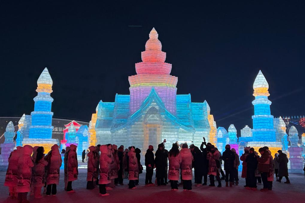 我國(guó)東北地區(qū)的冷與東南亞地區(qū)的熱,形成鮮明對(duì)比,吸引外國(guó)游客“一路北上”。在哈爾濱冰雪大世界,一座用冰復(fù)刻的“大皇宮”高21.5米,受到游客歡迎?!啊蕦m’晶瑩剔透,燈光下流光溢彩,太夢(mèng)幻了!”泰國(guó)游客金金說(shuō)。