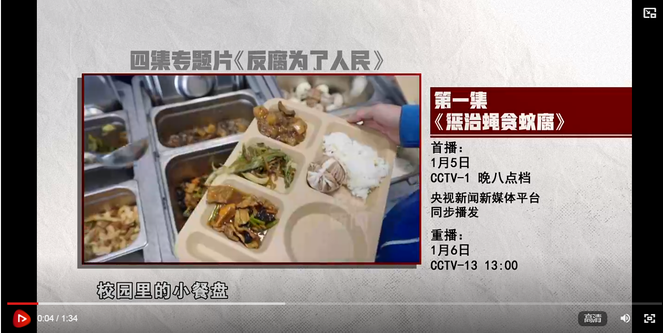 習(xí)近平總書記強(qiáng)調(diào),凡是群眾反映強(qiáng)烈的問題都要嚴(yán)肅認(rèn)真對(duì)待,凡是損害群眾利益的行為都要堅(jiān)決糾正。二十屆中央紀(jì)委三次全會(huì)上,習(xí)近平總書記對(duì)整治群眾身邊不正之風(fēng)和腐敗問題作出重要指示,要求懲治蠅貪蟻腐,讓群眾有更多獲得感。中央紀(jì)委國家監(jiān)委堅(jiān)決貫徹黨中央的決策部署,在全國部署開展群眾身邊不正之風(fēng)和腐敗問題集中整治。電視專題片《反腐 為了人民》第一集《懲治蠅貪蟻腐》,講述紀(jì)檢監(jiān)察機(jī)關(guān)聚焦群眾反映強(qiáng)烈問題,推動(dòng)開展校園餐、高標(biāo)準(zhǔn)農(nóng)田建設(shè)、住房保障和安居工程等整治工作,讓群眾從一個(gè)個(gè)具體問題的解決中感受到整治成果,不斷增強(qiáng)獲得感、幸福感、安全感。央視綜合頻道1月5日晚8點(diǎn)檔播出,央視新聞新媒體平臺(tái)同步播發(fā),敬請(qǐng)關(guān)注。