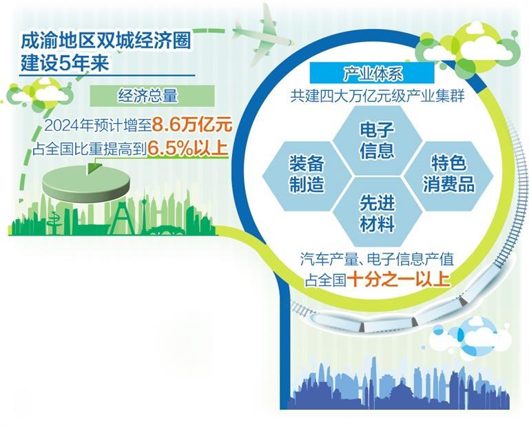 一是具有全國影響力的重要經(jīng)濟中心建設(shè)實現(xiàn)新躍升。經(jīng)濟總量上,雙城經(jīng)濟圈地區(qū)生產(chǎn)總值5年邁上了兩個萬億元級臺階,2024年預(yù)計增至8.6萬億元,占全國的比重由6.3%提高到6.5%以上;產(chǎn)業(yè)體系上,兩地共建電子信息、裝備制造、先進(jìn)材料、特色消費品四大萬億元級的產(chǎn)業(yè)集群,汽車產(chǎn)量、電子信息產(chǎn)值占全國十分之一以上。