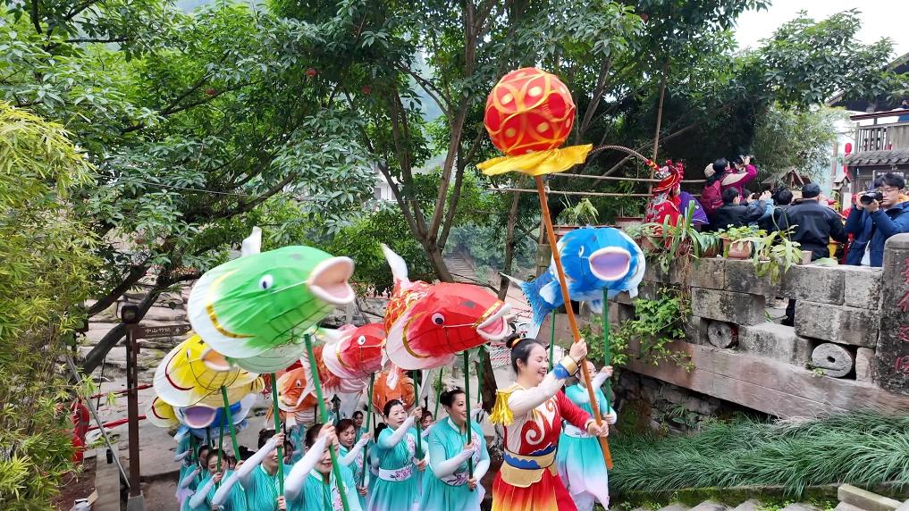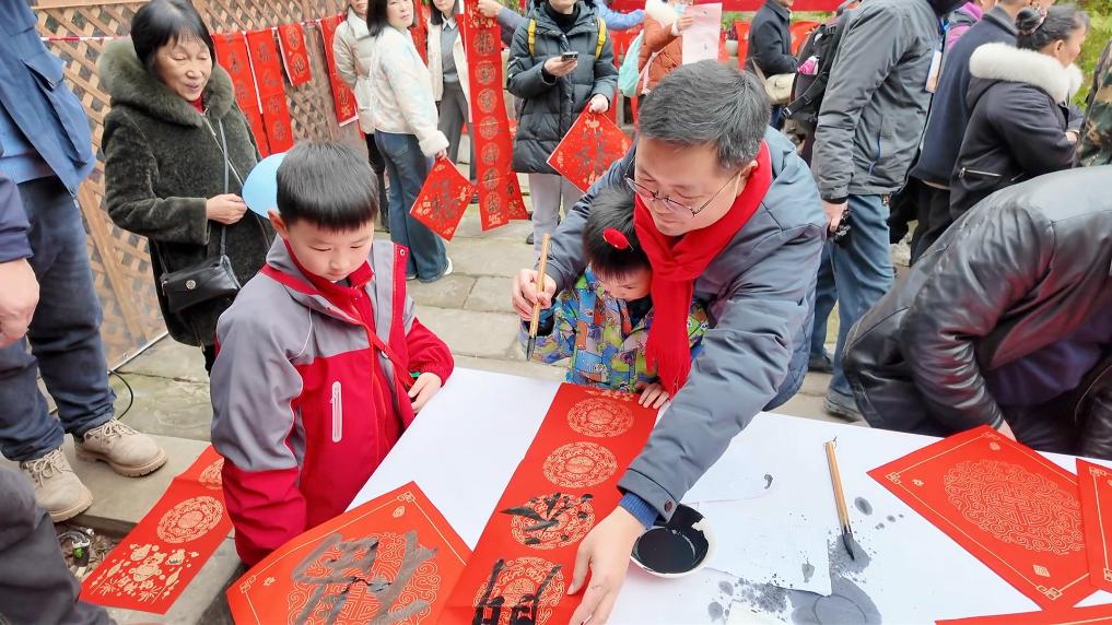 在當日的非遺巡游環(huán)節(jié),鯉魚燈、舞龍舞獅、雜耍、川劇變臉吐火、塘河鎮(zhèn)婚俗嗩吶、狀元巡街、財神送福等精彩節(jié)目接連上演,吸引眾多游客駐足拍照;在非遺文化體驗互動區(qū),書法家們揮毫潑墨,將書法藝術(shù)、民俗文化融為一體,創(chuàng)作出一幅幅作品,游客們排起長隊,依次領(lǐng)取“新年祝?!?。