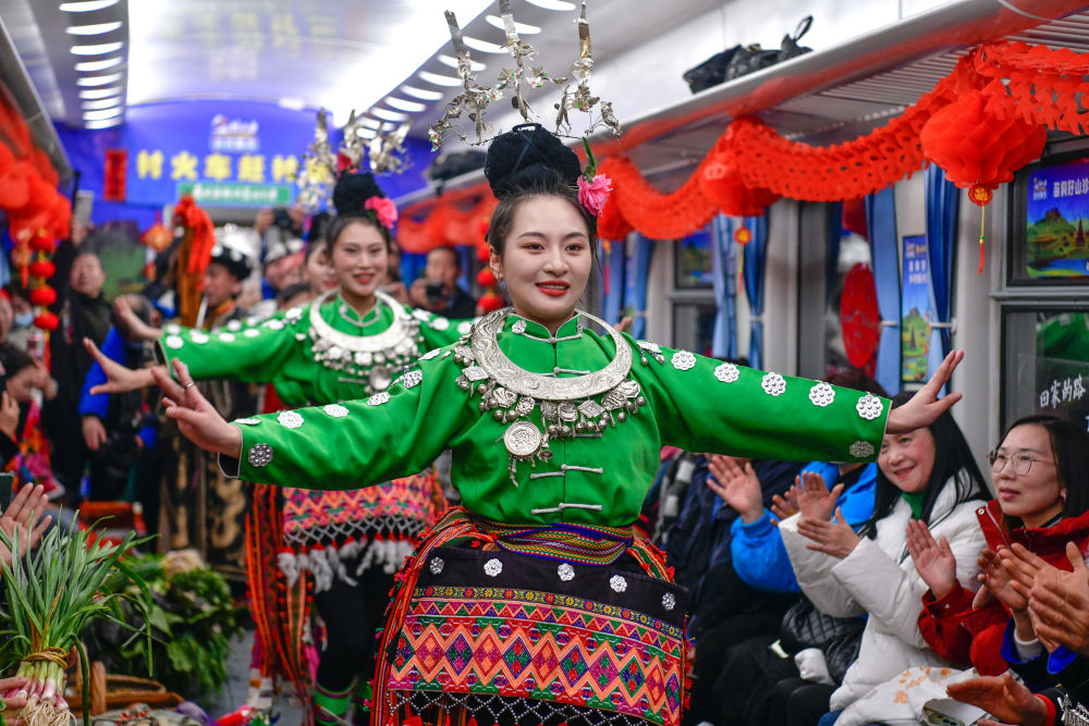 1月18日,少數(shù)民族演員在5640次列車上給乘客和村民跳苗族錦雞舞。新華社記者 楊文斌 攝