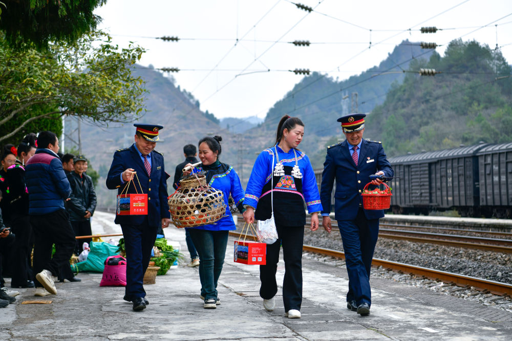 1月18日,在滬昆鐵路六個雞火車站,鐵路工作人員與村民交流當天售賣的農(nóng)產(chǎn)品情況。新華社記者 楊文斌 攝