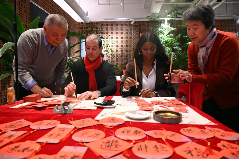 1月17日,外國(guó)人在大聯(lián)歡活動(dòng)中體驗(yàn)書法。當(dāng)日,“春暖朝陽·巳巳如意”中外居民大聯(lián)歡新時(shí)代文明實(shí)踐活動(dòng)在北京朝陽區(qū)左家莊街道舉行。新華社記者 金良快 攝