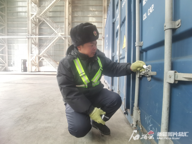 1月20日,譚磊正在阿拉山口站集裝箱換裝庫檢查集裝箱上的封印。石榴云/新疆日報(bào)記者 白素君 攝