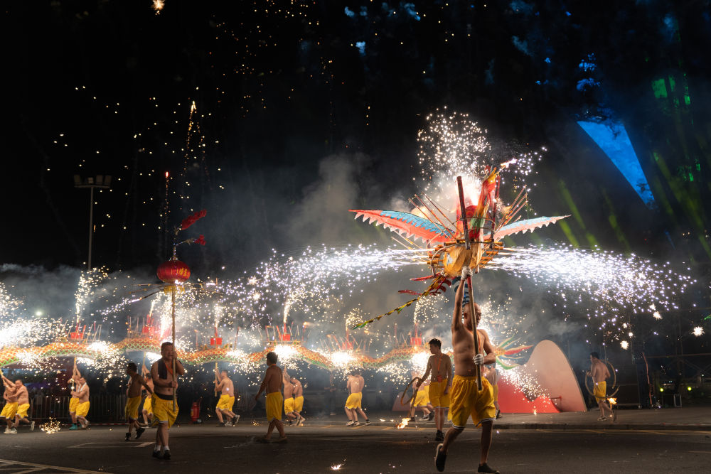 表演當晚,幾十名舞龍者手擎“火龍”,在繡球的逗引下繞場舞動?!盎瘕垺北稽c燃后,噴出繽紛焰火,舞龍者任由火花灑在他們身上,一時間鞭炮、鼓樂齊鳴,熱鬧非凡。