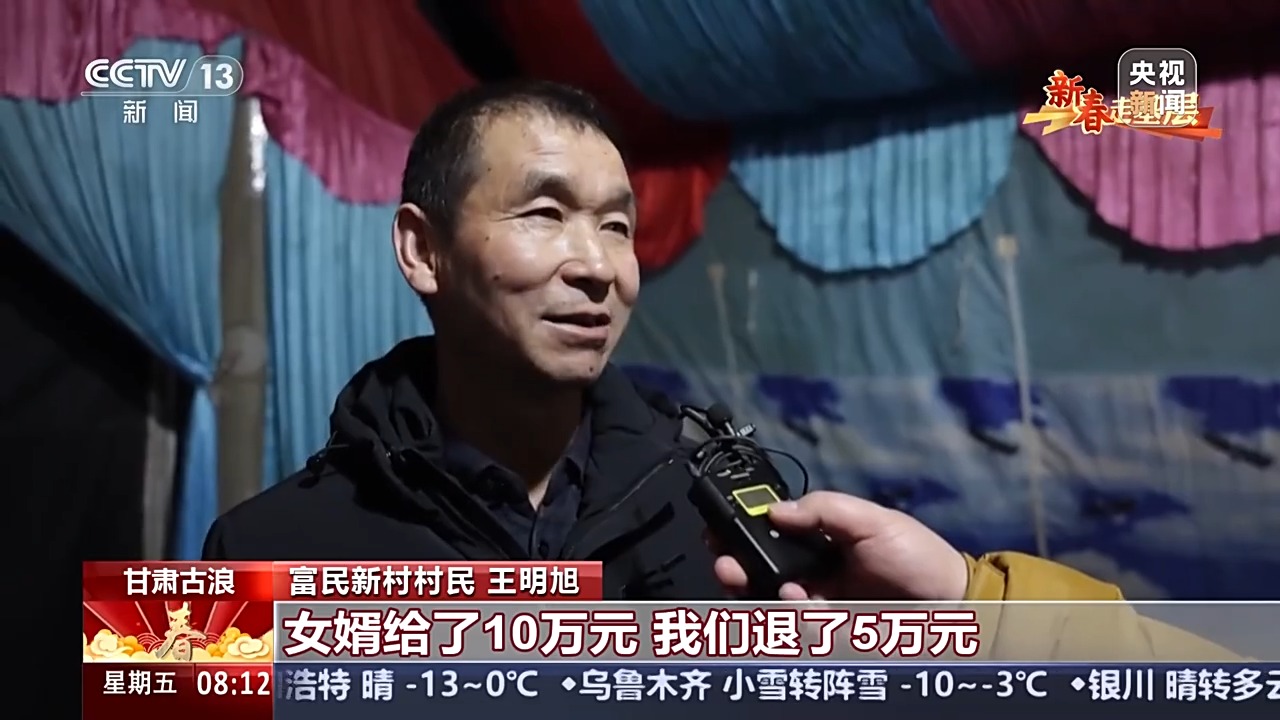 富民新村村民 王明旭:女婿給了10萬(wàn)元,我們退了5萬(wàn)元,剩下的用于婚禮的開(kāi)銷(xiāo)。要得多了,也是給年輕人增加負(fù)擔(dān)。