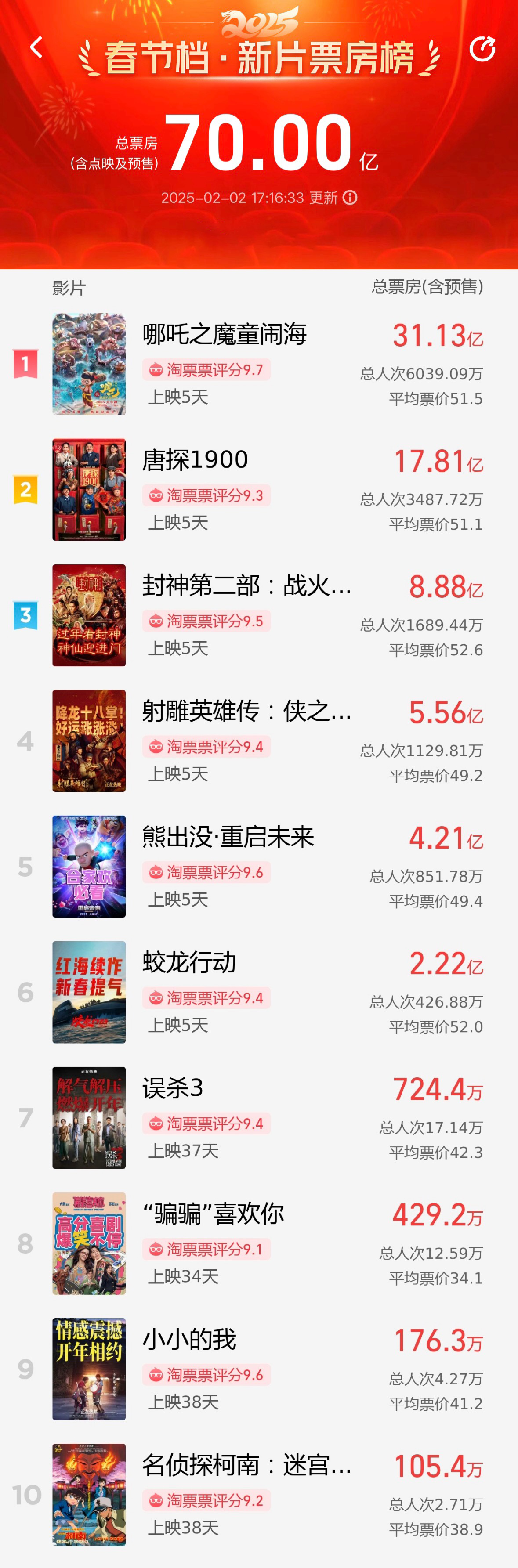 破70億!春節(jié)檔電影票房連續(xù)5天破10億