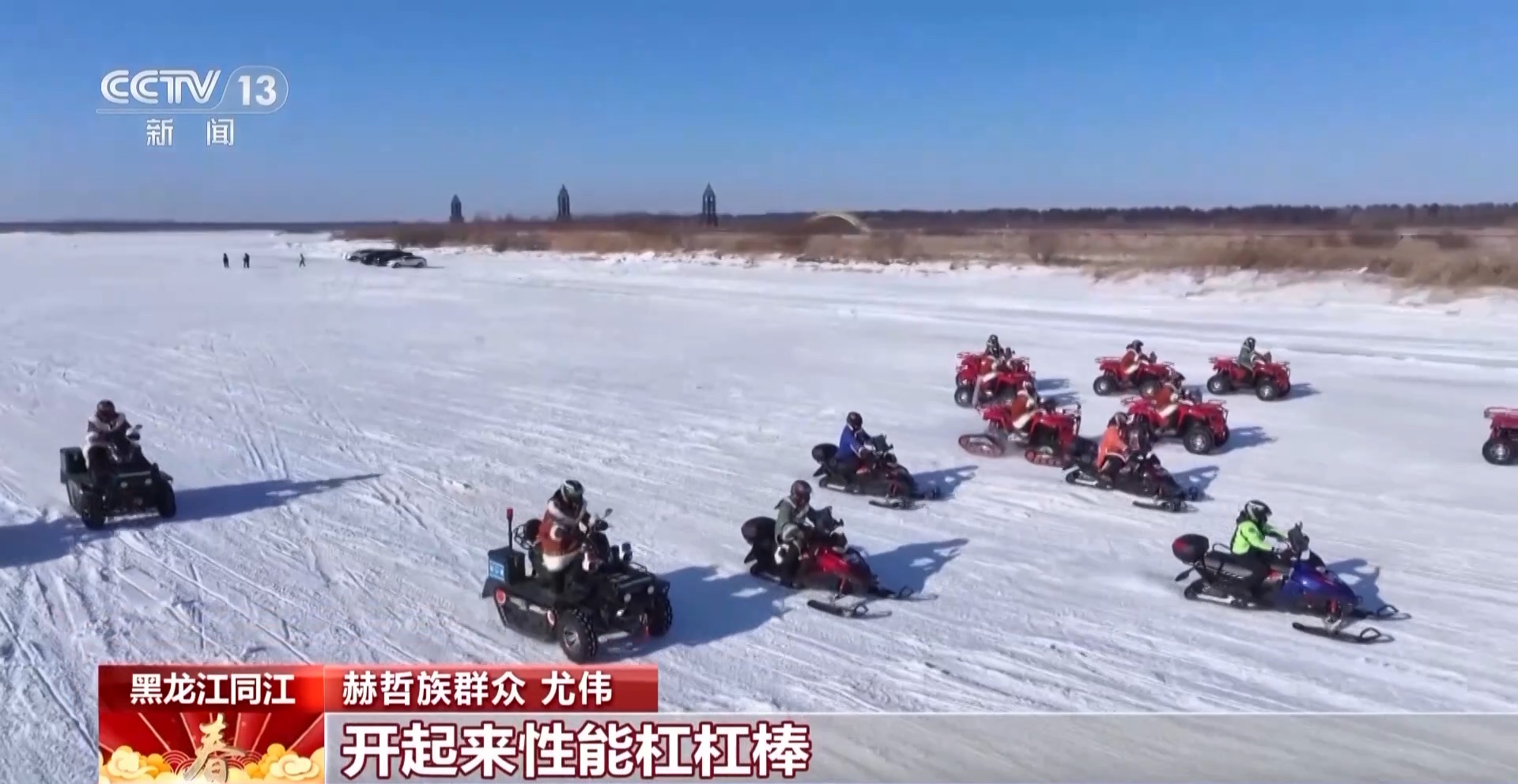 赫哲族群眾 尤偉:都以為赫哲族不以漁獵為主嘛,后期生活水平提高了,這款雪地摩托車是我們廠自己研發(fā)的,開起來(lái)性能杠杠棒。作為我們騎手來(lái)說(shuō),心情可好可棒了。