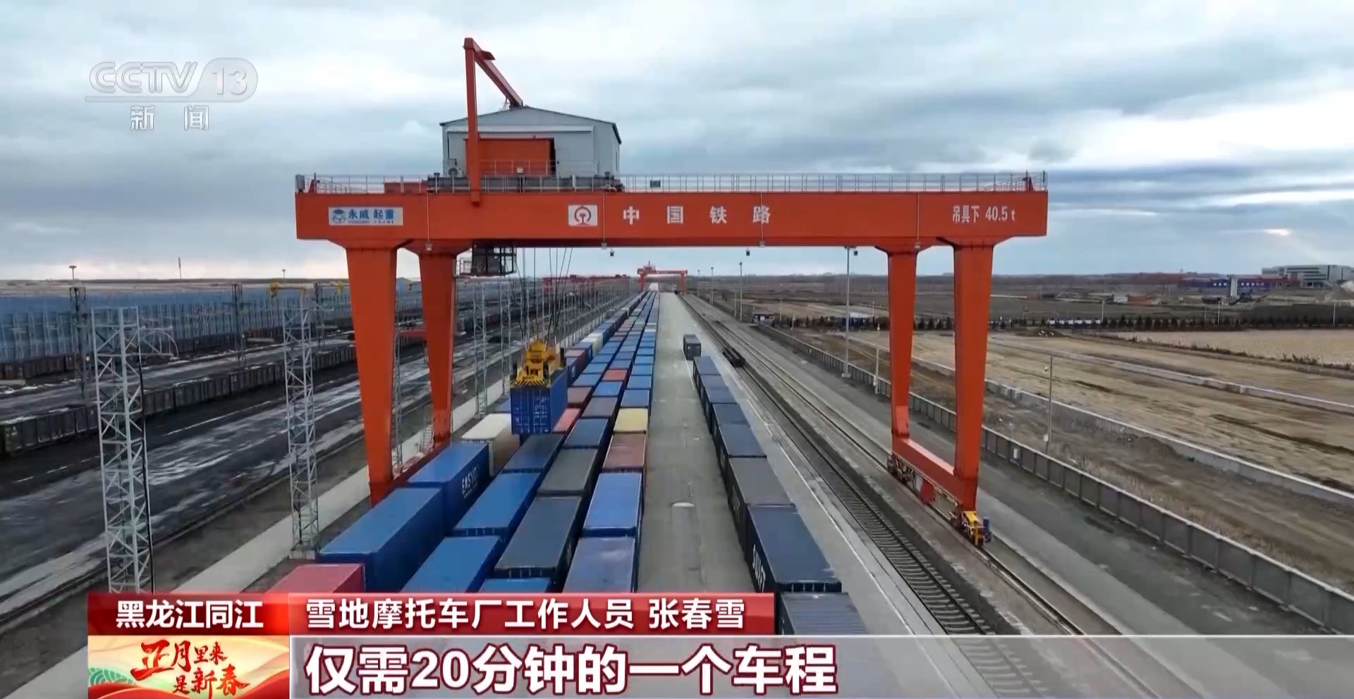 雪地摩托車廠工作人員 張春雪:工廠的產(chǎn)品從生產(chǎn)裝車,到咱們對(duì)岸的是俄羅斯的下列寧斯闊耶口岸,僅需20分鐘的車程。