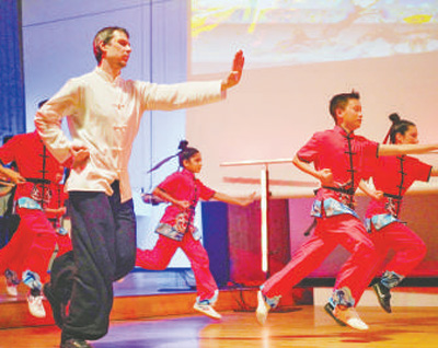 在2025年柏林及勃蘭登堡中國留學(xué)生蛇年春節(jié)聯(lián)歡晚會(huì)上,當(dāng)?shù)貙W(xué)生表演武術(shù)節(jié)目《中國武魂》。記者 劉 赫攝