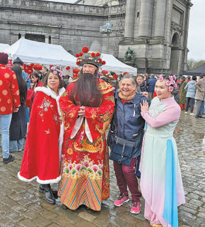 在比利時(shí)布魯塞爾舉辦的“中國春節(jié)游園廟會(huì)”上,當(dāng)?shù)赜^眾與廟會(huì)演員合影。記者 牛瑞飛攝