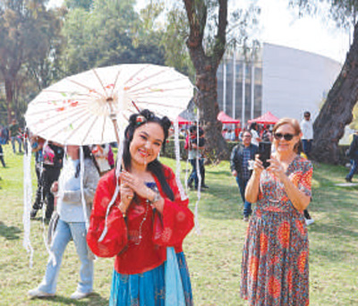 在墨西哥第四屆中國新年文化節(jié)上,當(dāng)?shù)厍嗄晟碇袊鴤鹘y(tǒng)服飾留影紀(jì)念。本報(bào)墨西哥分社 埃內(nèi)斯托·多明戈斯攝