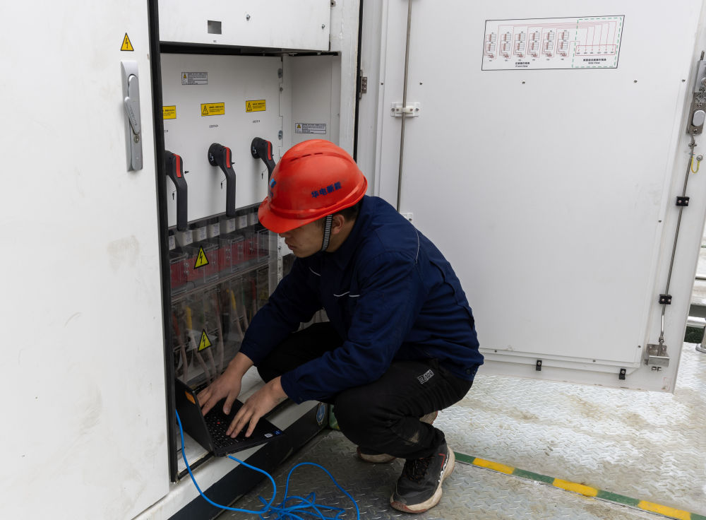18時許,楊升平和同事們結(jié)束當(dāng)天的檢查工作,回到山下的升壓站。楊升平向公司匯報一天的工作內(nèi)容,接著安排人員對儲能電池放電。