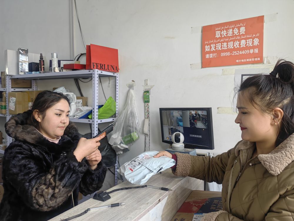 1月18日,在新疆喀什市荒地鄉(xiāng)一快遞代收點(diǎn),負(fù)責(zé)人塔吉尼沙·買買提力(左一)在為顧客掃描快遞單號。新華社記者蔡國棟 攝