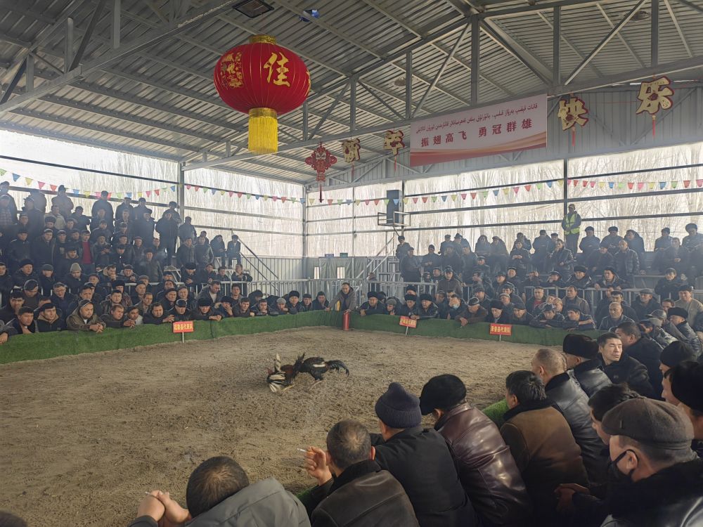 1月5日,在新疆喀什市牛羊大巴扎,觀眾在觀看斗雞比賽。新華社記者蔡國棟 攝