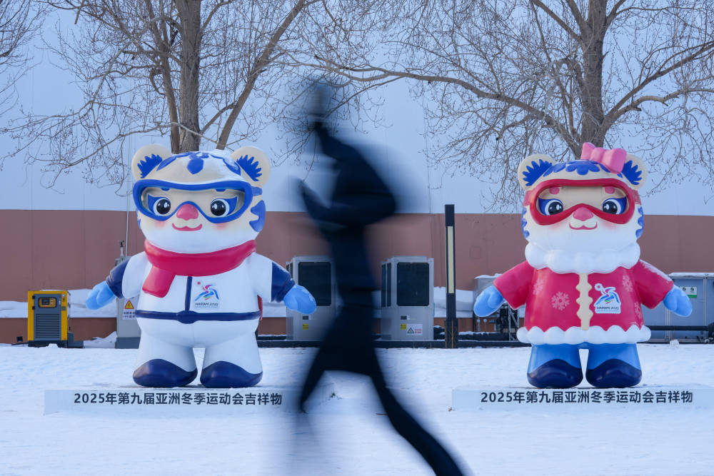 2025年1月8日,在哈爾濱湘江公園,跑步的市民從亞冬會吉祥物雕塑前經(jīng)過。
