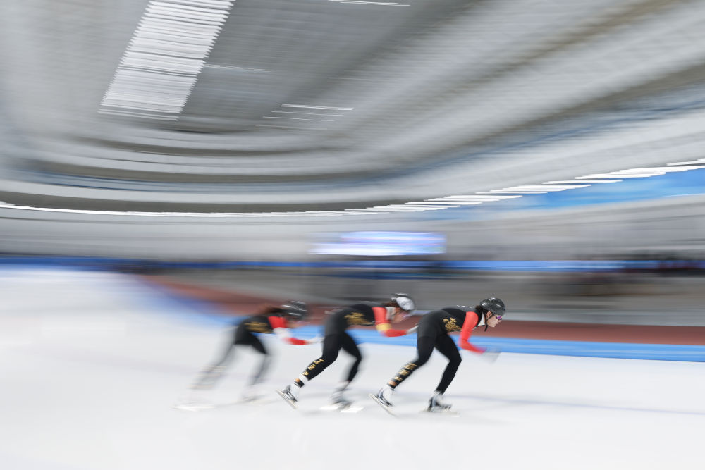 2024年12月15日,黑龍江省冰上訓(xùn)練中心二隊選手在比賽中。當(dāng)日,2024-2025賽季中國杯速度滑冰精英聯(lián)賽第四站暨亞冬會測試賽女子團體追逐比賽在黑龍江省冰上訓(xùn)練中心舉行。