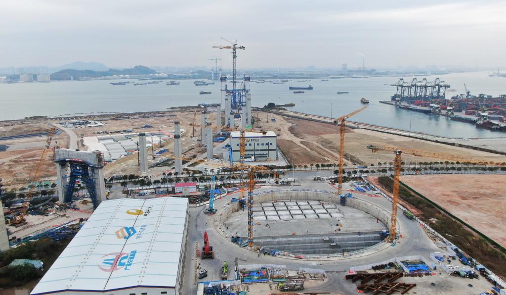 在珠江口東岸的東莞沙田鎮(zhèn)的施工現(xiàn)場(chǎng),獅子洋大橋的東主塔正進(jìn)入主塔橫梁施工階段。建設(shè)者們有的在焊接鋼筋,有的在吊運(yùn)材料。12根引橋墩柱成對(duì)排列,勾勒出平滑優(yōu)美的弧線,向遠(yuǎn)處直徑127米的超大錨碇延伸而去。
