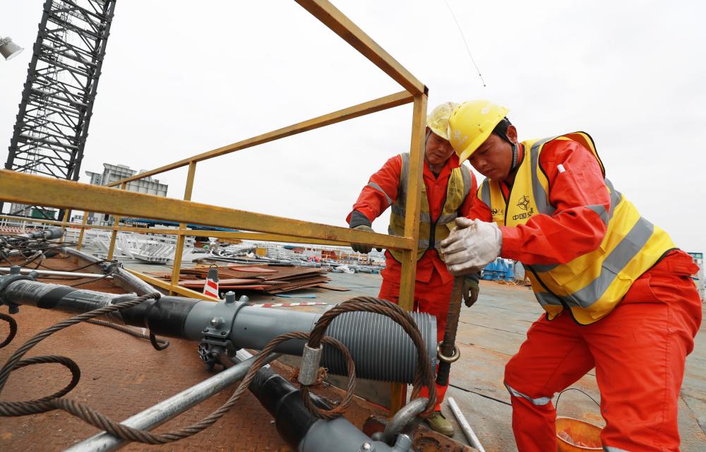 2月7日,工人在獅子洋大橋施工作業(yè)。新華社記者王瑞平 攝