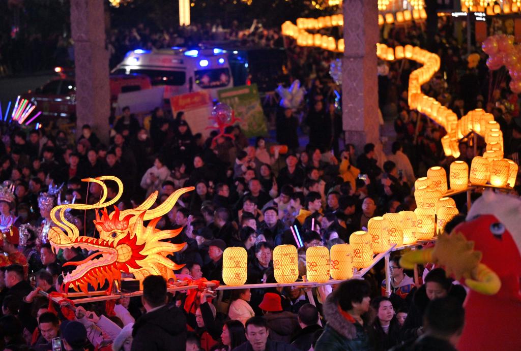 2月10日晚,在湖北省宣恩縣城興隆老街,百米板凳龍?jiān)谌巳褐杏涡?。新華社發(fā)(宋文攝)
