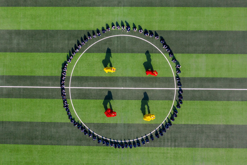 2月14日,山東省淄博科技學(xué)校龍獅社團(tuán)的學(xué)生在操場(chǎng)上進(jìn)行舞獅演練(無(wú)人機(jī)照片)。新華社發(fā)(張維堂攝)