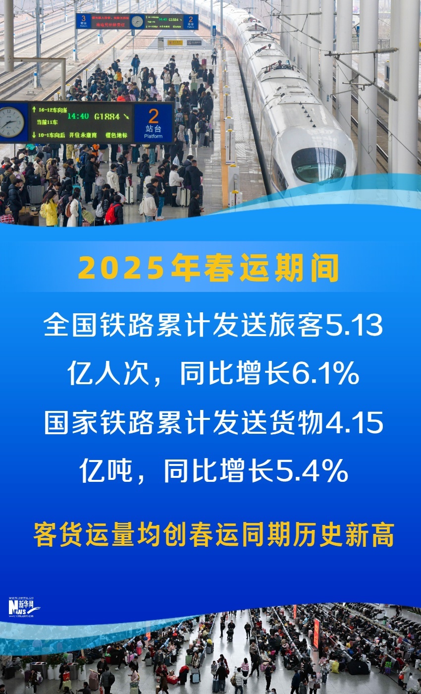 為期40天的2025年鐵路春運(yùn)圓滿收官。春運(yùn)期間,全國鐵路累計(jì)發(fā)送旅客5.13億人次,同比增長6.1%,國家鐵路累計(jì)發(fā)送貨物4.15億噸,同比增長5.4%,客貨運(yùn)量均創(chuàng)春運(yùn)同期歷史新高。