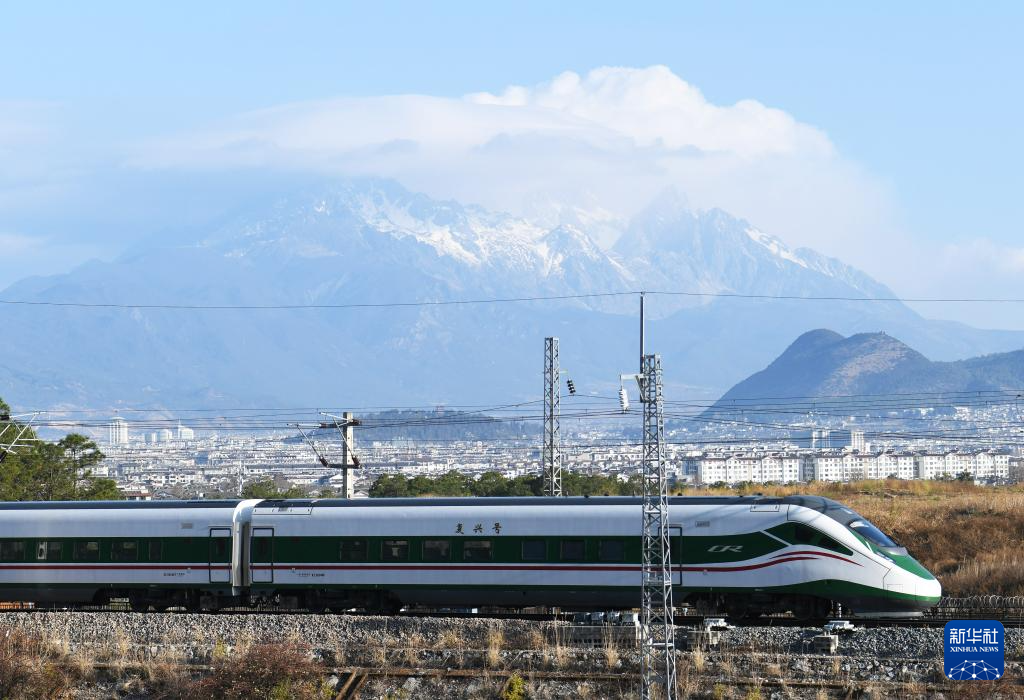 圖為2月22日,一列動(dòng)車組列車行駛在云南麗江玉龍雪山腳下的麗香鐵路線上。