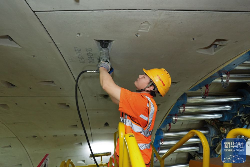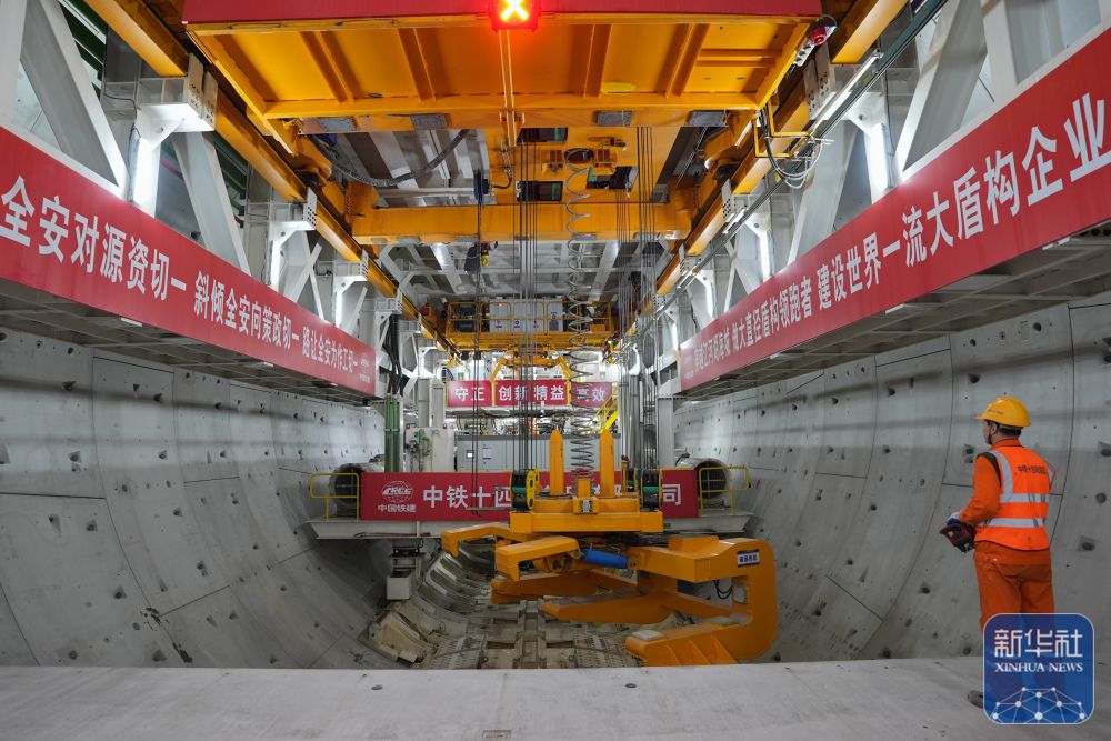 2月25日,中鐵十四局技術(shù)人員在甬舟鐵路金塘海底隧道“甬舟號”盾構(gòu)機內(nèi)調(diào)試箱涵吊機。