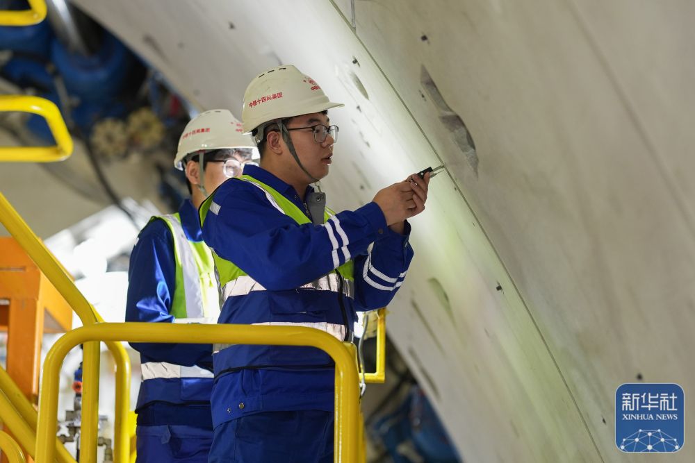 2月25日,中鐵十四局技術(shù)人員在甬舟鐵路金塘海底隧道“甬舟號”盾構(gòu)機內(nèi)測量管片拼裝作業(yè)情況。