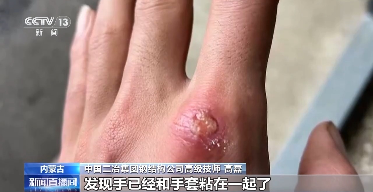 中國二冶集團(tuán)鋼結(jié)構(gòu)公司高級技師 高磊:如果你中途停止的話,再重新起弧就可能造成焊接缺陷,我就沒有選擇停,我就咬著牙堅(jiān)持把這段焊縫完成,直到焊到最后,等我往下摘我的焊工手套的時(shí)候,發(fā)現(xiàn)手已經(jīng)和手套粘在一起了,燙出特別大一個(gè)水泡。