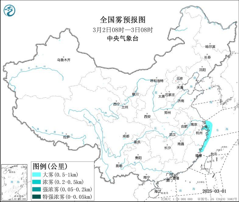 預計,3月2日白天至夜間,長江口及杭州灣附近海域、舟山群島附近海域、浙江沿岸海域、上海港、寧波港將有能見度不足1公里的濃霧。