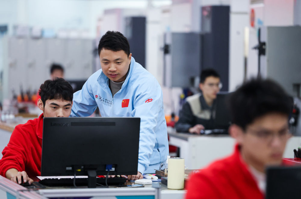 楊登輝(左二)指導(dǎo)學(xué)生對器件數(shù)控銑加工進(jìn)行程序編程。