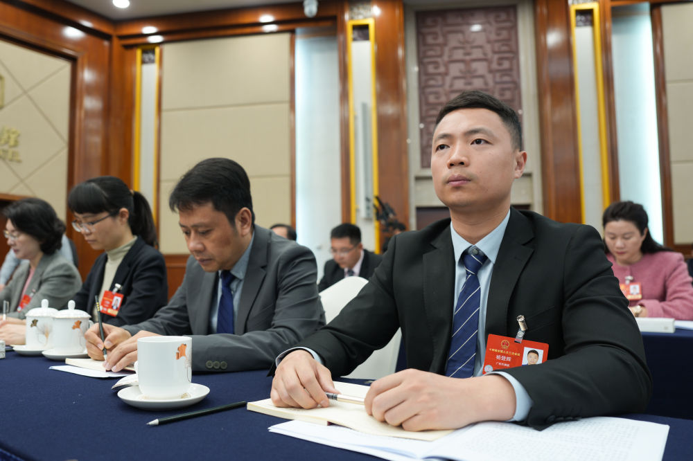 楊登輝(前右一)在十四屆全國人大三次會議廣東代表團(tuán)全體會議上認(rèn)真聽取發(fā)言。