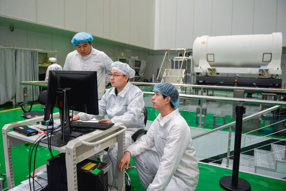 在長光衛(wèi)星相機(jī)裝調(diào)間,王升(右二)在調(diào)試衛(wèi)星光學(xué)遙感載荷組件時與團(tuán)隊成員討論細(xì)節(jié)。