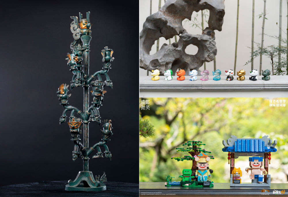 這是曾舟以青銅神樹、鎮(zhèn)水石犀、說唱俑等為原型設(shè)計的部分文創(chuàng)產(chǎn)品。