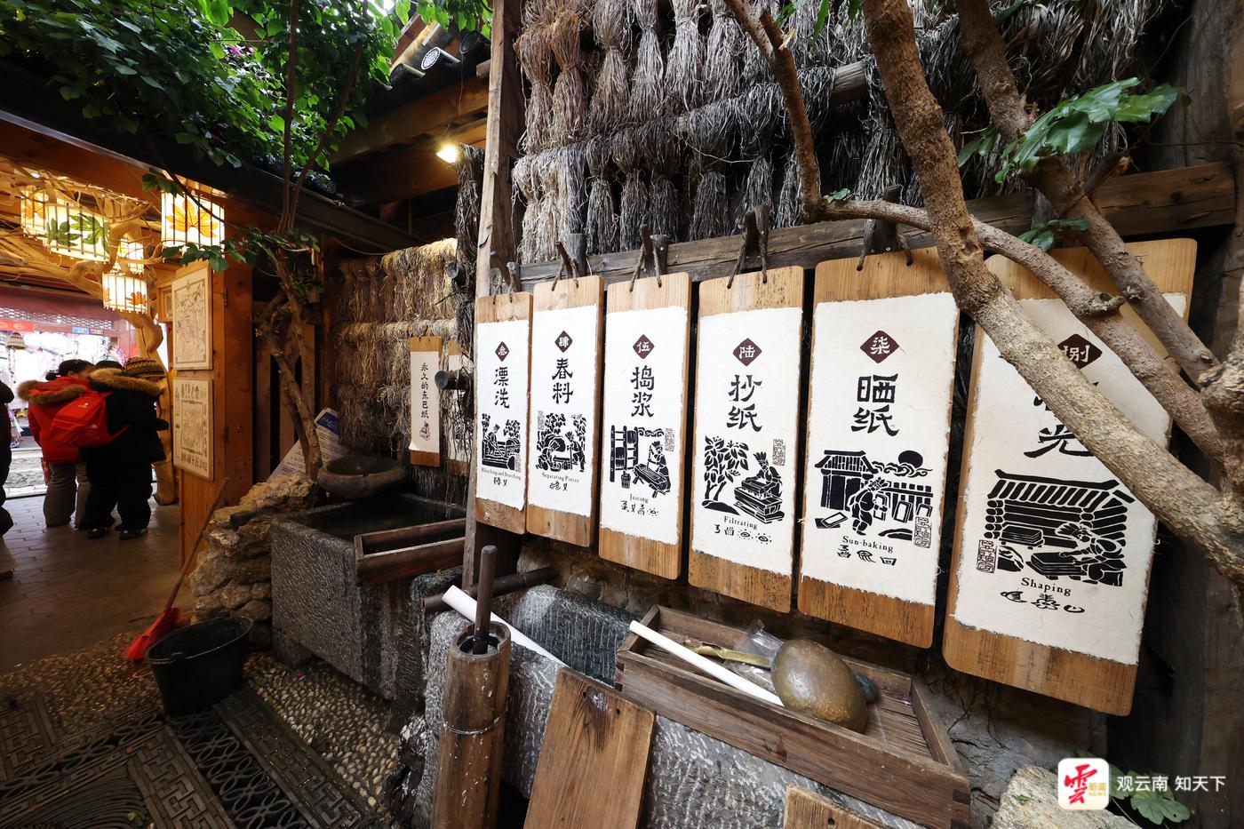 麗江古城內(nèi)以東巴文化體驗(yàn)為亮點(diǎn)的“東巴紙坊”吸引著許多中外游客。在這里,游客們可以體驗(yàn)到搗漿、抄紙、曬紙等東巴紙制作工藝,還能拿起東巴象形文字印章集章打卡。如果你好奇某個象形文字的含義,還能在這里買到一本東巴文“字典”,一一對照查看?!跋啾韧?,今年多了不少來自新加坡、馬來西亞的游客,東巴紙燈、明信片都是很受他們喜愛的產(chǎn)品?!睎|巴紙坊麗江銷售人員韓雨辰說。